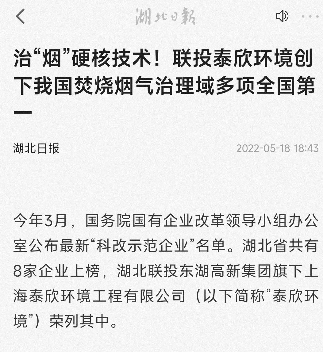 今年3月,國(guó)務(wù)院國(guó)有企業(yè)改革領(lǐng)導(dǎo)小組辦公室公布最新“科改示范企業(yè)”名單。湖北省共有8家企業(yè)上榜,東湖高新集團(tuán)旗下上海泰欣環(huán)境工程有限公司(以下簡(jiǎn)稱“泰欣環(huán)境”)榮列其中。